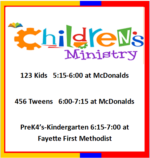 Every Wednesday evening the children ages 1st to 6th grade meet at Mcdonalds. Children ages 4 and 5 meet in the church fellowship hall. They learn about Jesus using games and music. Open to any child this age range who wants to attend. Parents are encouraged to stay and fellowship during this time. Please provide a meal for your child if they plan to eat.